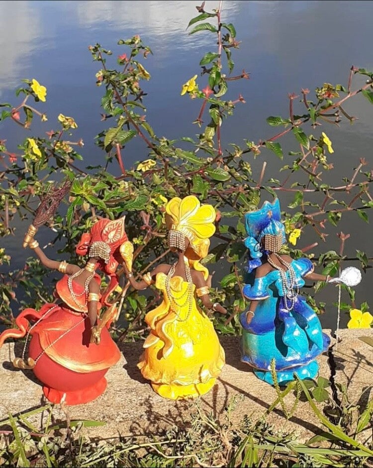 De gauche à droite, en rouge Iansã, déeese des vents et des tempête, de la mort et de la renaissance; en jaune Oxum, déese des eaux douces, dame de la beauté et de la fertilité, de l'argent et de la sensibilité; et pour finir en bleu, Yemanja, mère des Orixás (divinités de la nature), elle est la reine du monde aquatique, et représente la fertilité, la maternité et la famille.